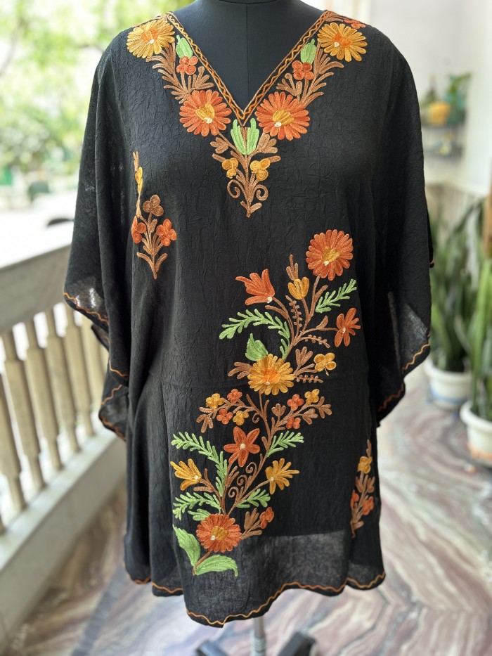 Black Kaftan with Orange & Green Floral Embroidery | Elegant Summer Style