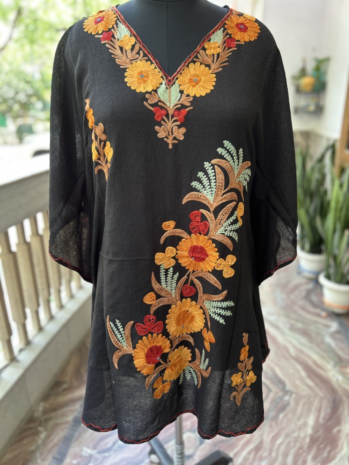 Black Kaftan with Yellow, Green & Red Floral Embroidery | Elegant Summer Style