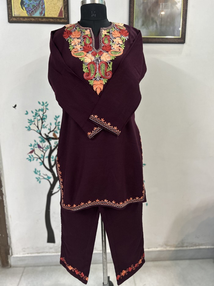 Burgundy Wool Blend Winter Cord Set with Kashmiri Aari Embroidery