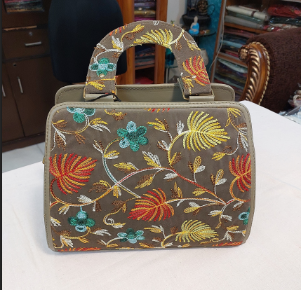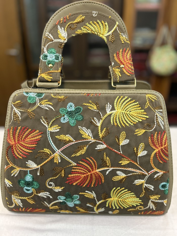 Add a touch of tradition to your style with this exquisite Kashmiri Aari embroidered handbag. Featuring vibrant floral patterns on an olive green base, this handcrafted bag is spacious, stylish, and perfect for any occasion. Whether paired with ethnic wear or a modern outfit, it adds timeless charm to your look.
