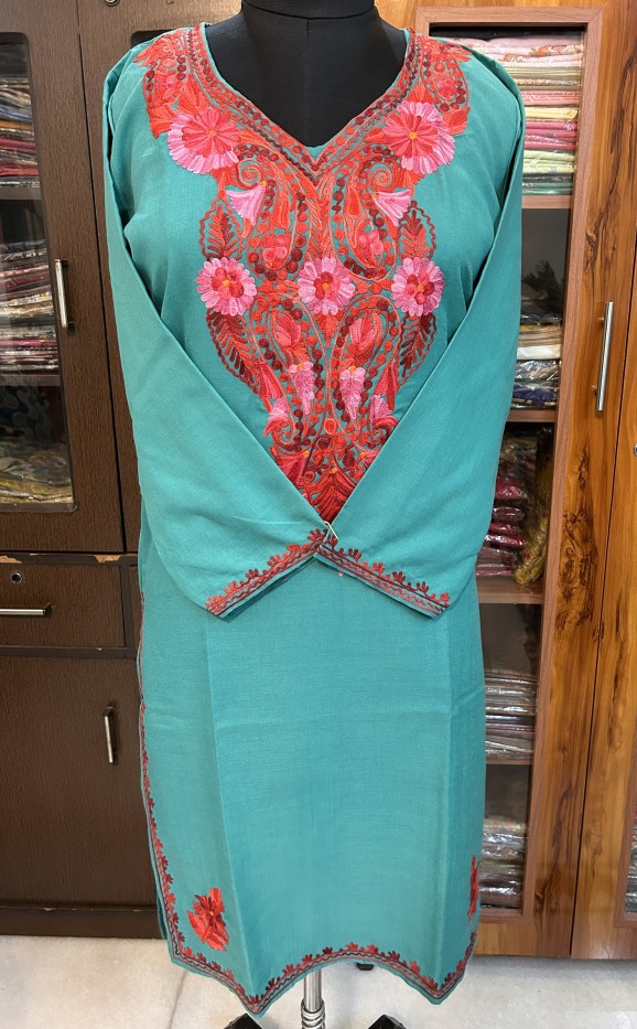 Add a splash of Kashmiri elegance to your wardrobe with this charming pistachio green cotton kurti, featuring exquisite hand Aari embroidery in warm orange and mustard threads. The classic paisley motifs on the yoke paired with floral detailing on the hem and cuffs reflect the richness of Kashmiri artistry. Made from breathable cotton fabric, it is perfect for everyday wear or semi-formal occasions, offering both comfort and traditional style. A timeless piece for those who appreciate understated sophistication.