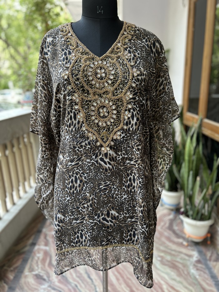 Make a bold style statement in this leopard-print kaftan with heavy beaded and sequin work on the neckline. Crafted from soft georgette, it's a perfect choice for evening glam or beachwear.
