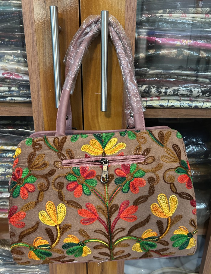 A charming satchel handbag that perfectly blends traditional craftsmanship with a contemporary silhouette. The main body features intricate, vibrant floral embroidery set against a warm, earthy background (like a dark taupe or light brown). The entire bag is framed with an elegant mauve/dusty rose faux leather piping and matching handles, creating a sophisticated color contrast. Its structured design ensures it holds its shape, making it ideal for carrying daily essentials in style. Perfect for adding a pop of color and texture to your outfit.