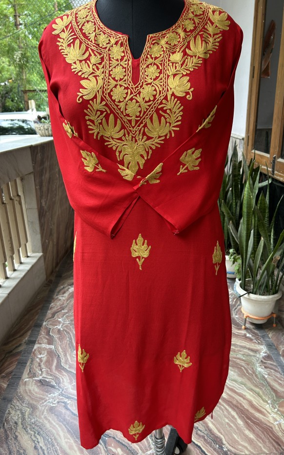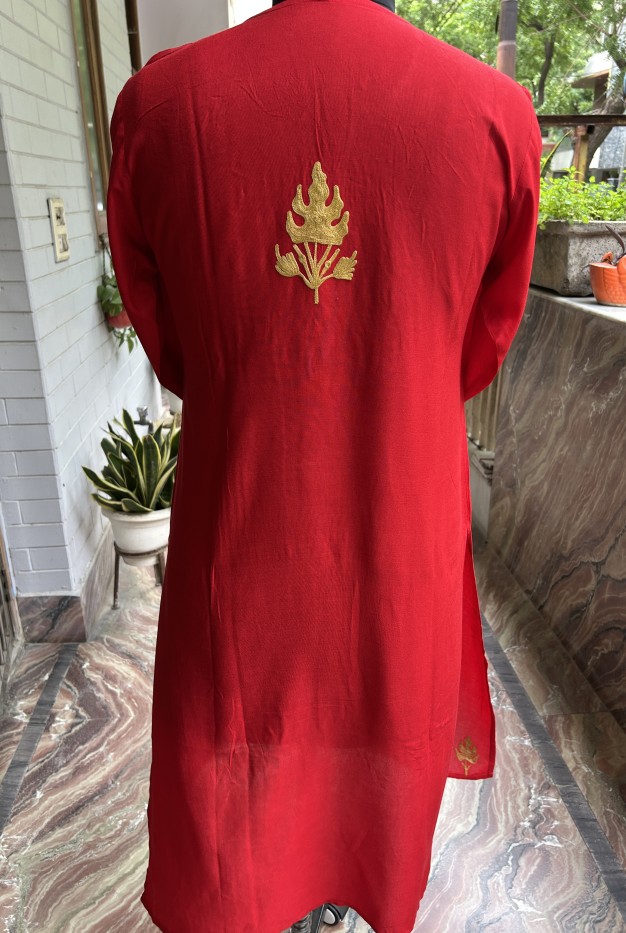 Our "Golden Chinar" Kashmiri Aari Embroidered Kurti is a perfect blend of tradition and contemporary fashion. The rich red fabric is beautifully adorned with intricate Kashmiri Aari work in shades of golden yellow, showcasing a beautiful floral vine pattern. The detailed embroidery on the neckline, sleeves, and hem transforms this kurti into a wearable work of art.