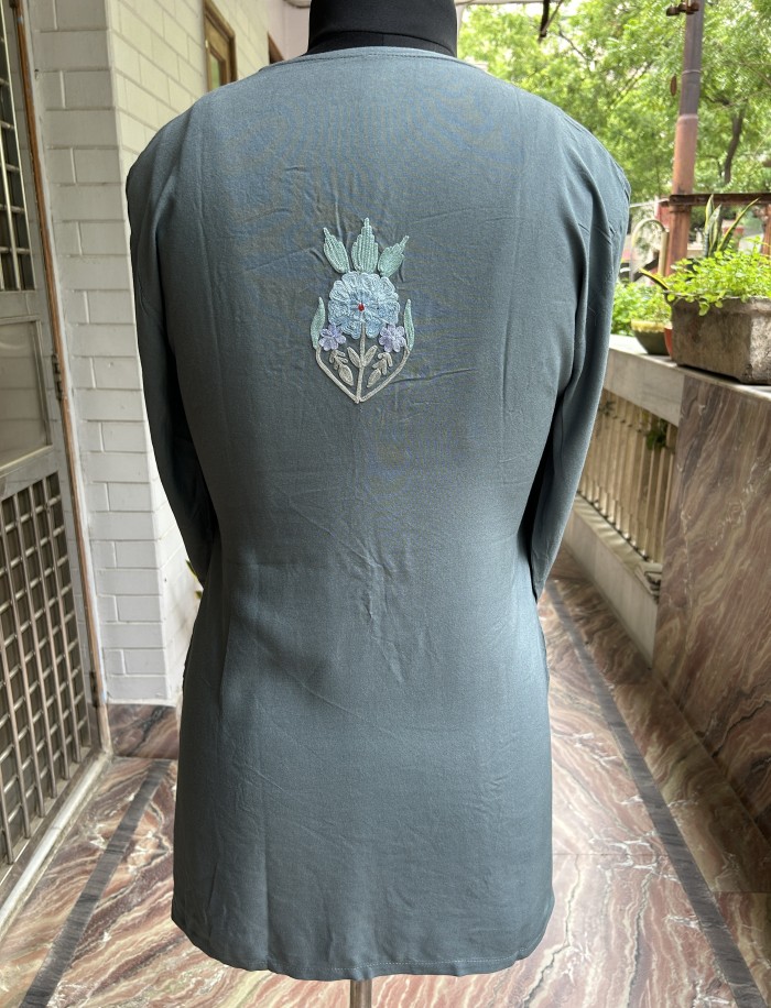 Our "Lavender Mist" Kashmiri Aari Embroidered Kurti is a perfect blend of delicate artistry and modern style. The soft gray fabric provides a subtle canvas for the exquisite hand-stitched Aari work in shades of blue and lavender. The intricate floral motifs on the neckline, sleeves, and throughout the body give it a unique charm.