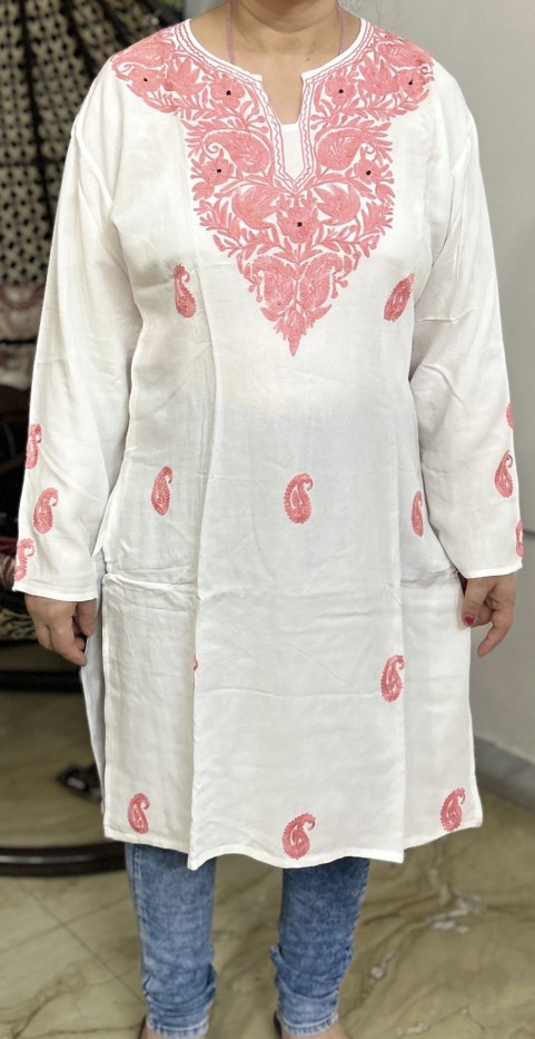 White Rayon Kurti with Pink Paisley Aari Embroidery - XXL size